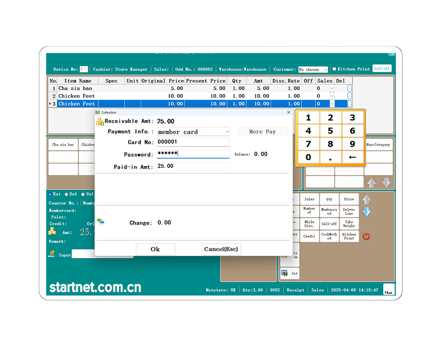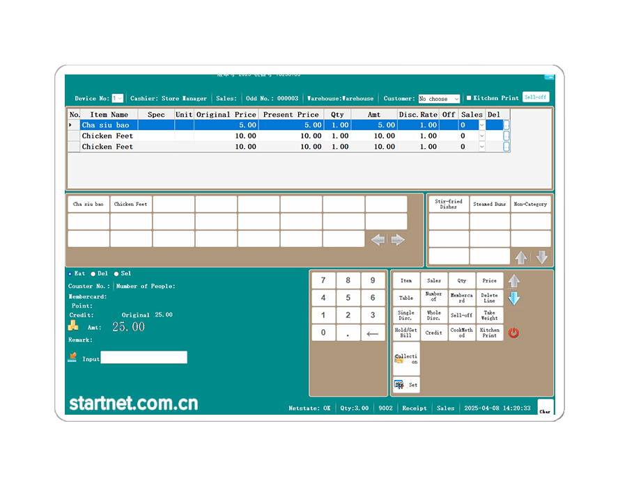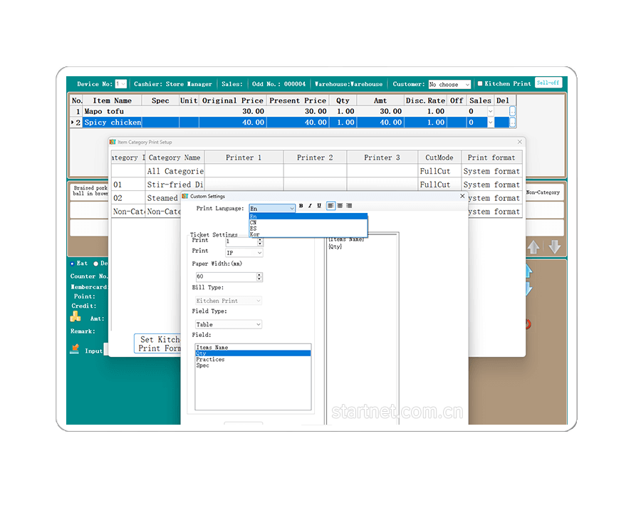 收银前台既可以全触摸屏输入,也可以扫描输入,支持分单打印,小票打印格式可以自定义,既可以一菜一单, 也可以一客一单,支持双屏POS、厨房打印等多种外设,网络直接驱动厨房打印,无需厨房电脑联网。