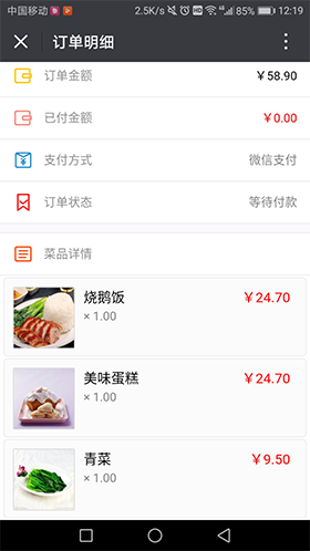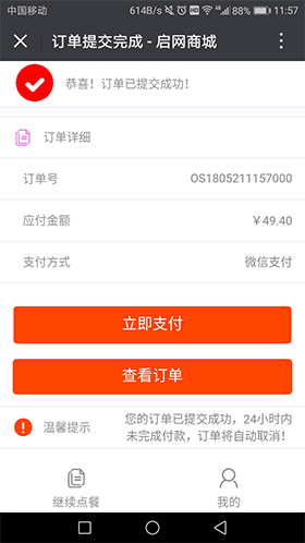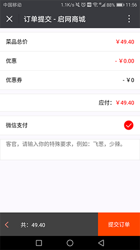 支持多种订单支付方式:支付宝、微信支付、现金到付、优惠券等。